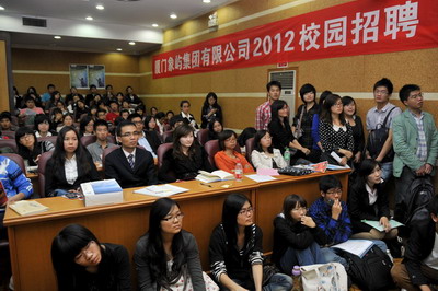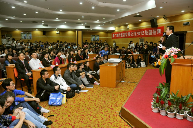 2012年象嶼集團(tuán)全國校園招聘首場宣講會(huì)于11月23日晚在廈門大學(xué)拉開帷幕。集團(tuán)人力資源總監(jiān)林志勇、象嶼股份人力資源部經(jīng)理林焱為同學(xué)們進(jìn)行了精彩的宣講并回答了同學(xué)們現(xiàn)場的提問,鼓勵(lì)廈大的優(yōu)秀學(xué)子們加入到象嶼的大家庭。據(jù)悉,此次宣講會(huì)吸引了近500位應(yīng)屆生參加,場面火爆,提問環(huán)節(jié)積極踴躍,會(huì)后現(xiàn)場收到簡歷近500 份。