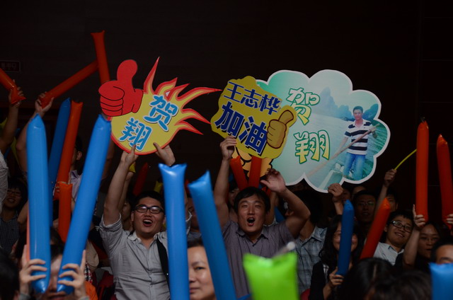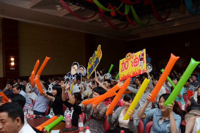 在激揚的歌曲聯(lián)唱《五月的花海》中,歌唱比賽正式開始。16名選手按組別輪流登場,現(xiàn)場精彩萬分。歌聲或激蕩高昂,或宛轉(zhuǎn)悠揚,或徐徐如風,或渾厚有力;表現(xiàn)力或動感十足,或動靜相宜,或幽靜宜人;曲風各異,或熱辣奔放,或溫暖抒情,或自然歡快,或懷舊悠揚。啦啦隊陣容也不容小覷,加油牌、口哨、熒光棒一應(yīng)俱全,或歌唱伊始吶喊助威,或伴隨著歌聲興奮地揮舞著手臂,更有甚者激動地走到臺上為選手喝彩,臺上臺下照相印襯、融為一體。期間,軍企拉歌、擊鼓傳花等活動環(huán)節(jié)也將比賽推向一個又一個高潮。