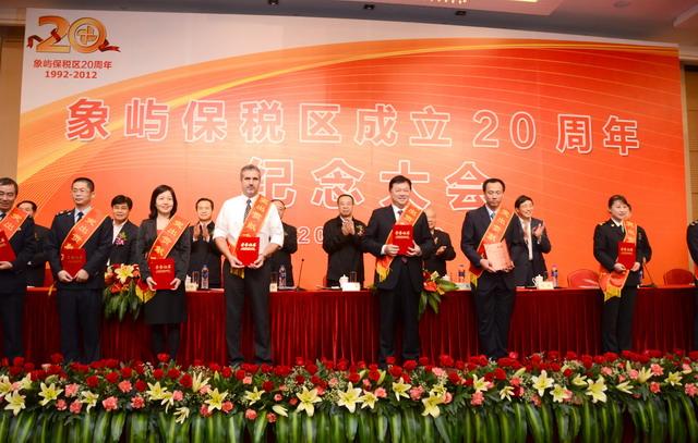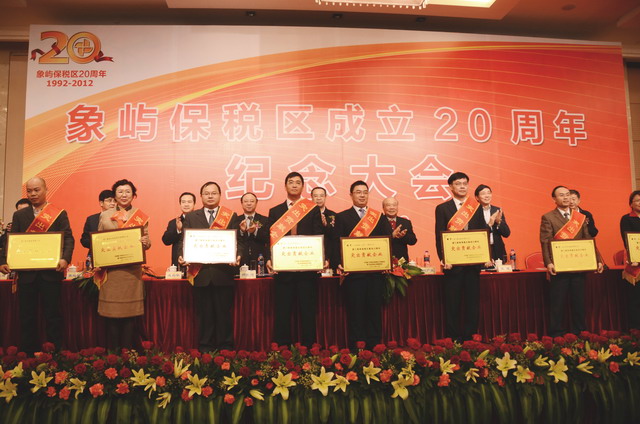 11月28日上午,在慶祝廈門象嶼保稅區(qū)成立20周年的喜慶日子里,廈門市委、市政府隆重舉行慶祝大會,回顧保稅區(qū)20年的奮斗歷程,總結保稅區(qū)20年的發(fā)展經驗,展望保稅區(qū)更加美好的發(fā)展未來。為保稅區(qū)建設立下汗馬功勞的10家突出貢獻企業(yè)和10位突出貢獻個人受到了隆重表彰。其中,廈門象嶼集團有限公司、廈門象嶼股份有限公司榮獲突出貢獻企業(yè),象嶼集團黨委書記、董事長王龍雛,象嶼建設集團常務副總經理王澍陶榮獲突出貢獻個人。