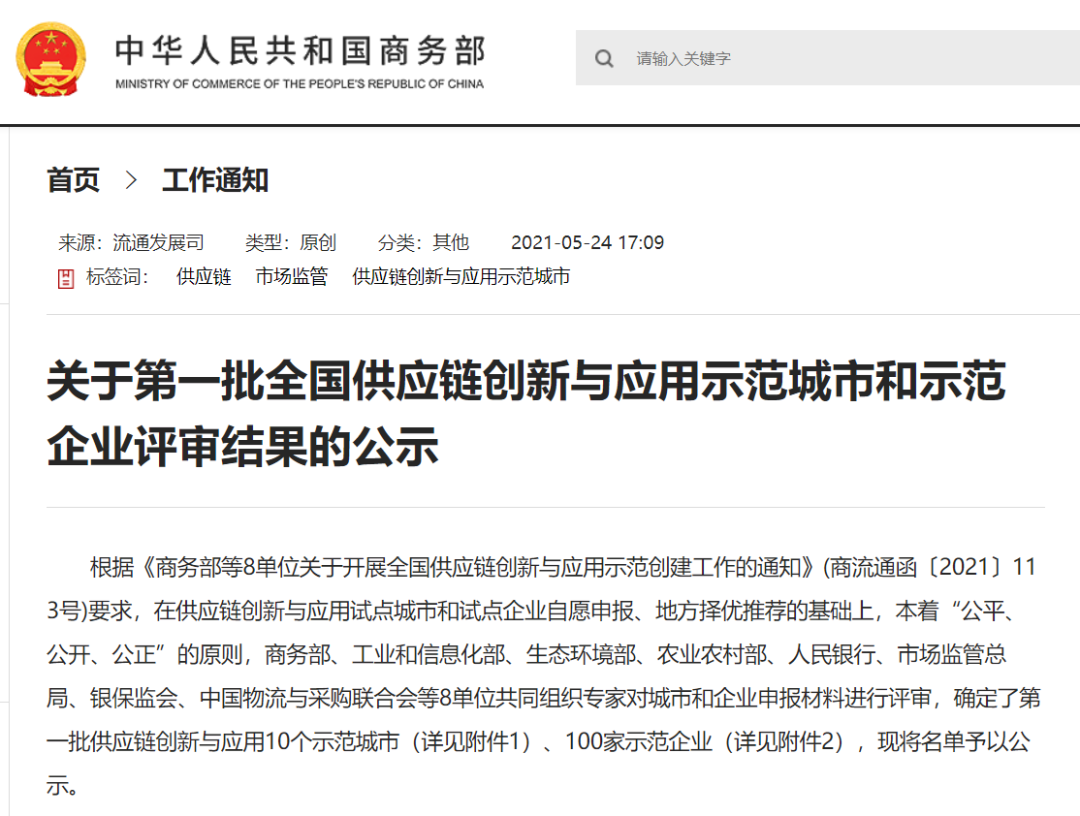 商務(wù)部此次公示的“全國供應(yīng)鏈創(chuàng)新與應(yīng)用示范城市和示范企業(yè)評審結(jié)果”,是商務(wù)部、工業(yè)和信息化部、生態(tài)環(huán)境部、農(nóng)業(yè)農(nóng)村部、人民銀行、市場監(jiān)管總局、銀保監(jiān)會、中國物流與采購聯(lián)合會等8單位共同組織專家對城市和企業(yè)申報(bào)材料進(jìn)行評審確定的結(jié)果。