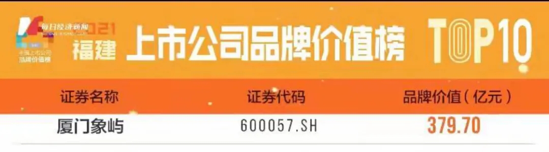 近日,由每日經(jīng)濟(jì)新聞主辦的“2021中國(guó)上市公司品牌價(jià)值藍(lán)皮書發(fā)布暨中國(guó)資本市場(chǎng)年度榮譽(yù)盛典”成功舉辦。廈門象嶼繼此前入圍“2021中國(guó)上市公司品牌價(jià)值活力榜TOP 100”后,再次入圍“2021福建上市公司品牌價(jià)值榜TOP 10”,品牌價(jià)值高達(dá)379.70億元,同時(shí)公司董事會(huì)秘書廖杰榮獲“2021最佳主板上市公司董秘”。