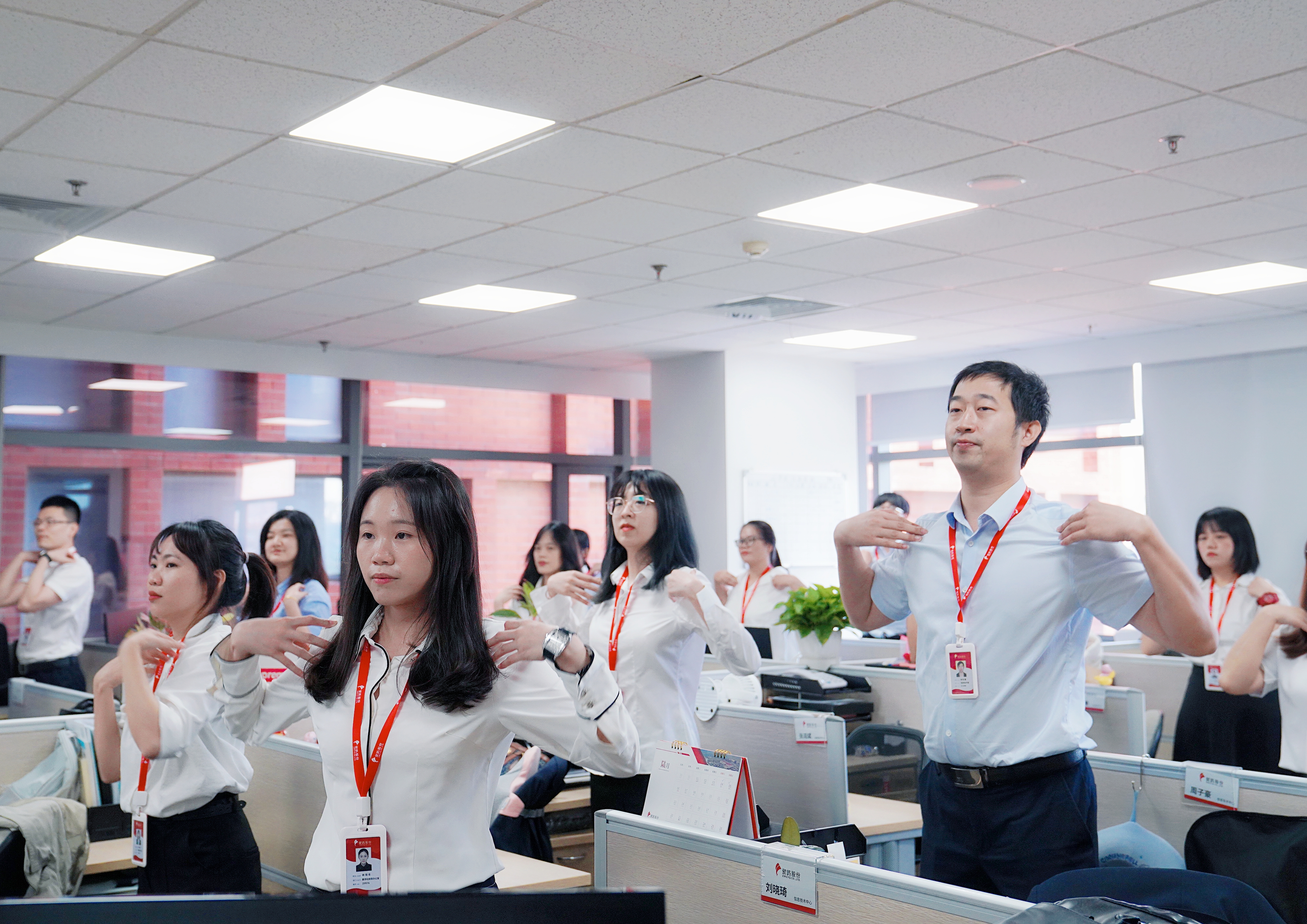 早上十點半,隨著律動音樂的響起,大家紛紛從工位上起身,加入到了活力工間操隊伍中。一二三四,五六七八,二二三四,五六七八……頭部運動、體側(cè)運動、擴胸運動、體轉(zhuǎn)運動……每一個節(jié)拍,每一個動作,無不體現(xiàn)著象嶼人的朝氣蓬勃和積極向上!
