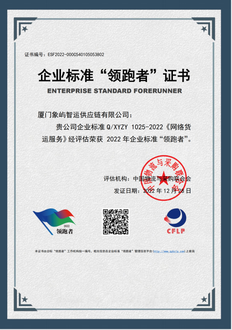 近日,“企業(yè)標準領(lǐng)跑者管理信息平臺”正式發(fā)布“物流服務(wù)”領(lǐng)域首批企業(yè)標準“領(lǐng)跑者”企業(yè)名單。象嶼股份旗下廈門象嶼智運供應(yīng)鏈有限公司憑借高水平的網(wǎng)絡(luò)貨運服務(wù)質(zhì)量,良好的服務(wù)信譽以及扎實的企業(yè)管理體系,榮膺首批網(wǎng)絡(luò)貨運服務(wù)“領(lǐng)跑者”。